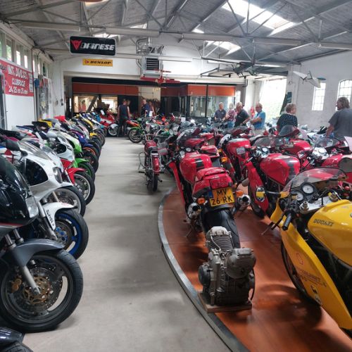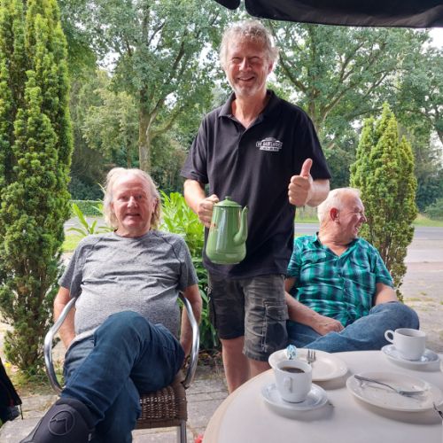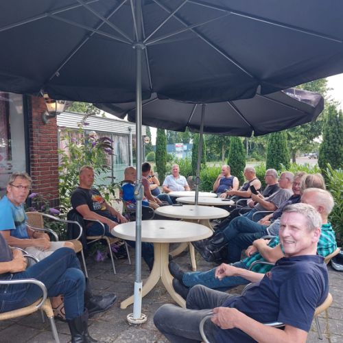De koffie stop stond gepland bij het motormuseum De Ramshoek in Emmer-Compascuum, een initiatief van Germa en Martin Willems. Hier hadden zich nog 2 leden gemeld om zich ook bij de groep aan te sluiten (en om alvast het terras in te richten). Totaal 18 personen dus, een hele mooie opkomst.
