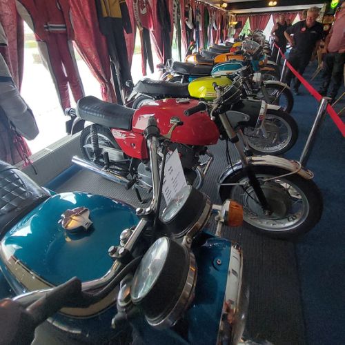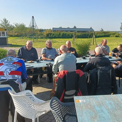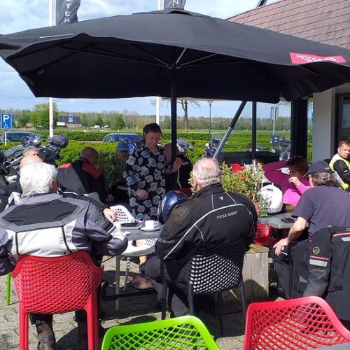 De koffie stop stond gepland bij het motormuseum De Ramshoek in Emmer-Compascuum, een initiatief van Germa en Martin Willems. Hier hadden zich nog 2 leden gemeld om zich ook bij de groep aan te sluiten (en om alvast het terras in te richten). Totaal 18 personen dus, een hele mooie opkomst.