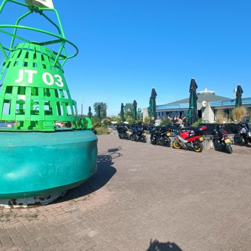 De koffiestop was bij het restaurant Het Booze Wijf in Lauwersoog waar we lekker buiten op terras in de zon konden genieten van koffie met appelgebak of oranjekoek of cheesecake.